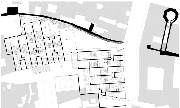 La antigua muralla almohade de Écija es la protagonista de este proyecto. Se propone la implantación de 15 viviendas unifamiliares en este singular solar, que cuenta con acceso por dos calles a diferentes cotas. La creación